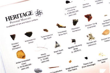 The Heritage Museum is a collection of artifacts from the history of the world. The specimens have been specifically selected and curated for the museum. From meteorites and dinosaur fossils to barbed wire from D-Day, the personal museum includes artifacts from some of the most important events in history. Each artifact is carefully prepared for inclusion. The samples are then professionally cast in acrylic. The museums are polished to a glass-like surface and will last for generations with proper care. After achieving the first successful flight in a plane, Orville Wright stated, "We were lucky enough to grow up in an environment where there was always much encouragement to children to pursue intellectual interests; to investigate whatever aroused curiosity.” That is exactly what the Heritage Museum is intended for! Whether for yourself, for others, or to share with children, this personal museum is an exceptional learning tool. Each artifact in the museum is authentic and has inherent historical importance. The artifacts span not only the history of the world but also the history of the universe.