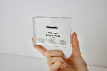 The Battle of Iwo Jima marked a pivotal confrontation between U.S. Marines and Japanese forces during World War II. The island's capture was crucial for the Allied forces' strategic goals in the Pacific. The battle was brutal and resulted in high casualties, requiring determination and sacrifice from those involved. The grains of sand included in this display originate from the beaches of Iwo Jima and serve as a tangible link to that historic and momentous conflict.