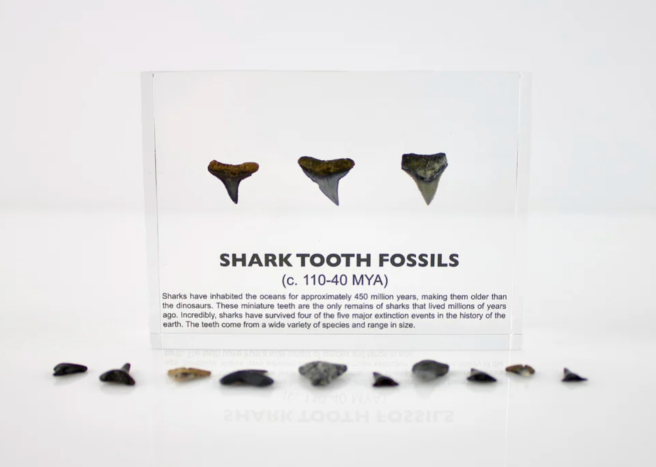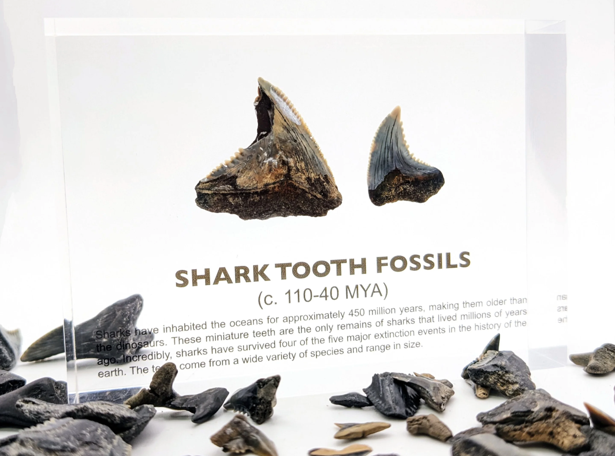 The Shark Tooth Fossil Bundle features real ancient shark teeth beautifully displayed on a sturdy base. This set lets anyone own a genuine piece of natural history, perfect for collectors, students, or anyone fascinated by prehistoric ocean life.